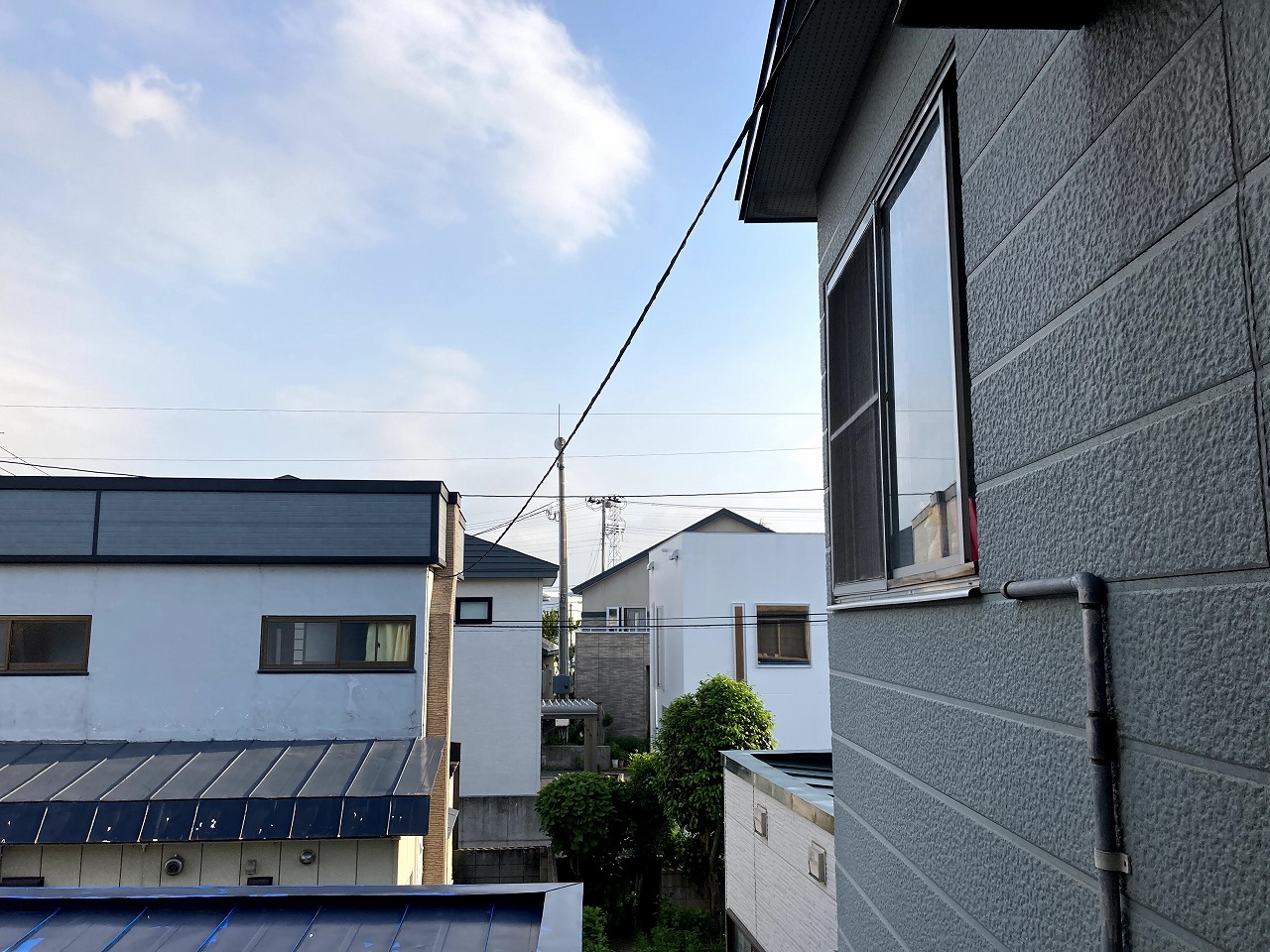 今回離れの住宅がありました。同じ敷地内に2つの建物があり1回線でネット環境をまかないたいと思う方は多いと思います。今回は母屋の2階から屋外用LANケーブルを離れの2階側までつなげる工事を行いました。冬に屋根からの落雪が心配無い場所であれば可能な作戦です。各建物で2回線を契約するよりは配線工事してしまった方が経済的です。